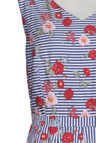| Details | Plissee, ärmellos, V-Ausschnitt, Reißverschluss/Knöpfe hinten, Floral, Streifen |