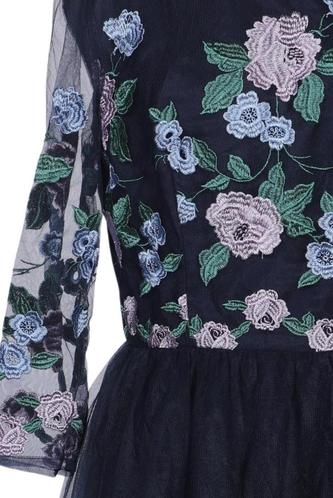| Détails | Broderie, Tulle, Manches trois-quarts, Encolure en V, Fermeture éclair/boutons arrière, Fleuri |