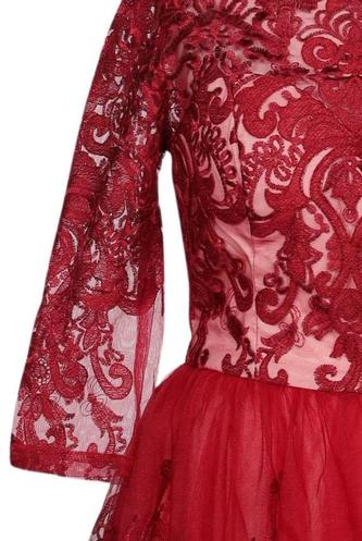 | Détails | Broderie, Tulle, Manches trois-quarts, Encolure en V, Fermeture éclair/boutons arrière, Fleuri |