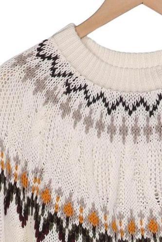 | Détails | Grosse maille, Manches longues, Col rond, Ethnique |