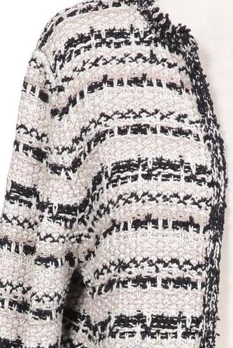 | Détails | Franges, Grosse maille, Manches longues, Col rond, Patte de boutonnage avant, Rayures |