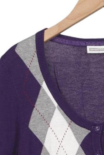 | Détails | Grosse maille, Manches courtes, Col rond, Patte de boutonnage avant, Argyle |