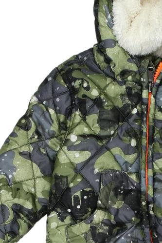 | Détails | Matelassé, Fausse fourrure, Polaire, Capuche amovible, Élastique/cordon de serrage, Fermeture éclair avant, Camouflage |