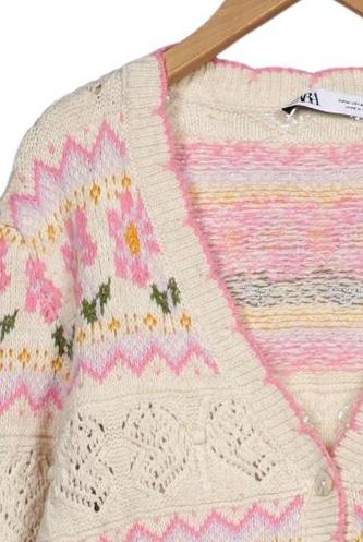 | Détails | Grosse maille, Manches longues, Patte de boutonnage avant, Fleuri |