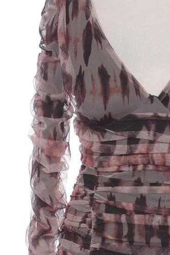 | Détails | volants, Tulle, Manches longues, Encolure en V, Fermeture éclair/boutons arrière, Imprimé à motifs |