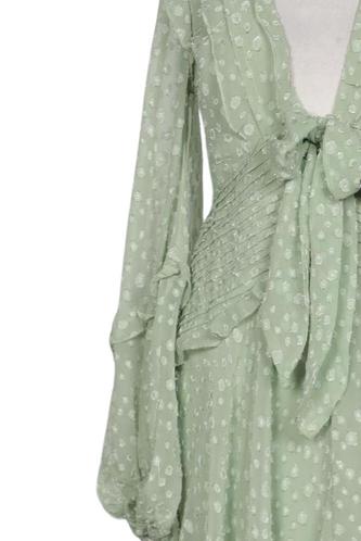 | Détails | Découpes, volants, Chiffon, Manches longues, Encolure en V, Fermeture éclair/boutons arrière, À pois |