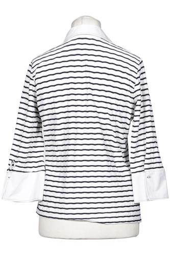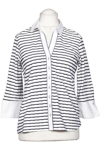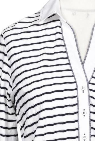 | Détails | Jersey, Manches trois-quarts, Encolure en V, Patte de boutonnage avant, Rayures |