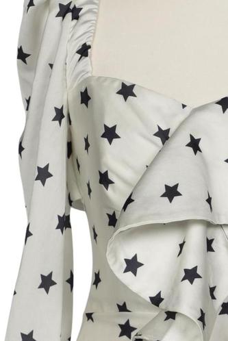 | Détails | Satin, volants, Manches longues, Encolure en V, Fermeture éclair/boutons arrière, Imprimé à motifs |